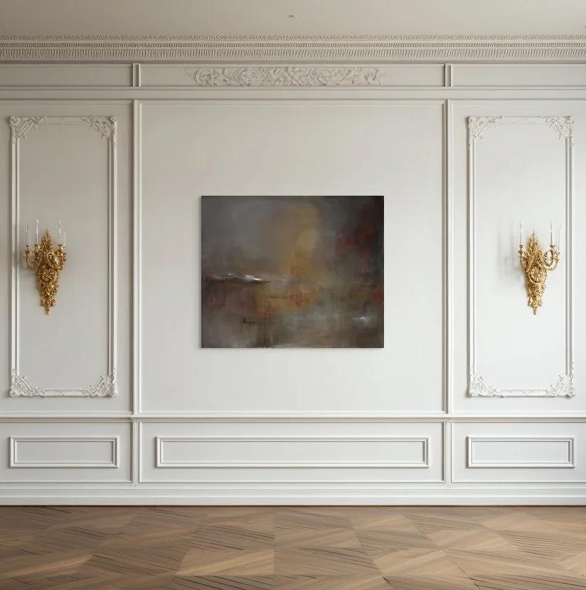 Harbour was painted during one of the many lockdowns. A substantial and commanding work, it carries a powerful contradiction - storm and stillness, turbulence and calm. The canvas evokes the sense of a storm that has just passed: a lingering restlessness offset by the glow of distant light. With its rich, warm, and earthy tones, it has been described as possessing the drama and luminosity often associated with Turner, imbuing the work with an intense atmospheric depth.