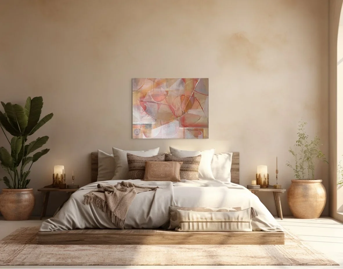 It sits beautifully above a fireplace or alone on a wall to create a colourful but subtle statement. Painted on deep-edged canvas, it can be hung as it is or framed.