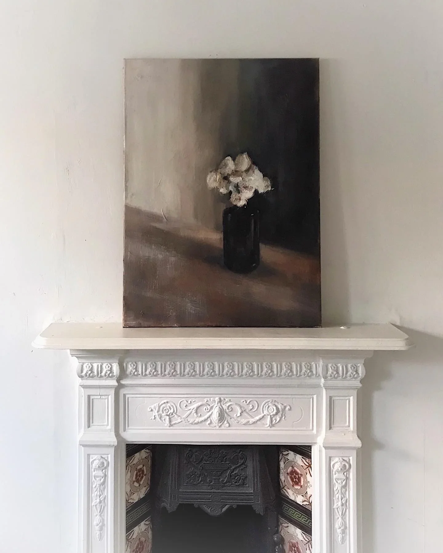 Painted during lockdown when flowers were sometimes the only company I had for hours. It was a deep appreciation of the thought behind them, left outside my front door, which prompted this painting. They are in an old Hendrick’s bottle which I think make beautiful vases.